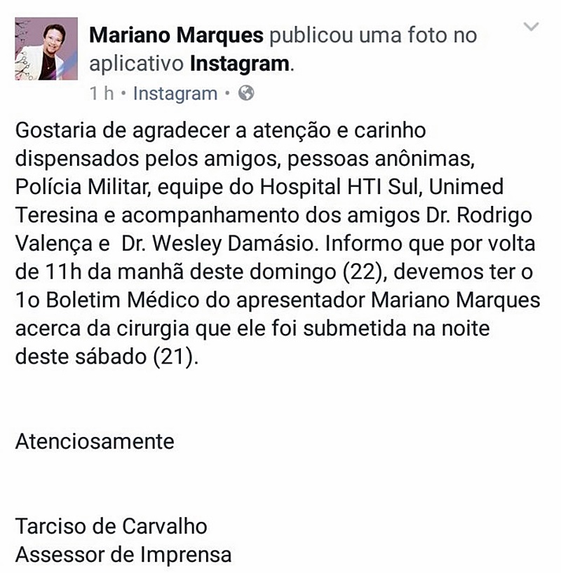 O colunista Tarciso de Carvalho agradeceu através da página de Mariano Marques no Facebook: